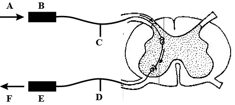 The following scheme shows the path of a reflex arc. Identify the different labels A, B, C, D, E, F in the reflex arc.