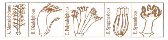 The following diagrams A, B, C, D, and E show the different types of arrangements of stamens based on the cohesion of their parts in different plants. Assign the stamens to their respective plants. Choose the correct answer.