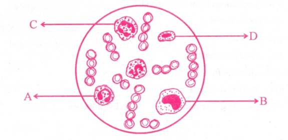 A = Erythrocyte, B = Basophil, C = Neutrophil, and D = Lymphocyte