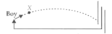A boy throws a cricket ball from the boundary to the wicket-keeper. If the frictional force due to air cannot be ignored, the forces acting on the ball at the position \( X \) are represented by
