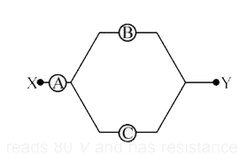 Three voltmeters A, B, and C having resistances $ R $, $ 1.5R $, and $ 3R $ respectively are used in a circuit as shown. When a P.D. is applied between X and Y, the readings of the voltmeters are $ V_1 $, $ V_2 $, and $ V_3 $ respectively. Then