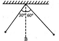 From a fixed support, two small identical spheres are suspended by means of strings of length 1 m each. They are pulled aside as shown and then released. B is the mean position. Then the two spheres collide?