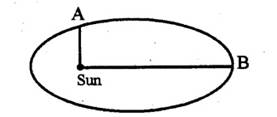 Earth is moving around the Sun in an elliptical orbit as shown. The ratio of \(OB\) to \(OA\) is \(R\). Then the ratio of the Earth's speed at A and B is