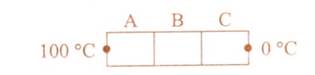 Their thermal conductivities are $K$, $2K$, and $\frac{K}{2}$. The free end of A is at $100^\circ C$ and the free end of C is at $0^\circ C$. During steady state, the temperature of the junction of A and B is nearly... $^\circ C$.