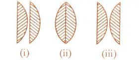 Two thin plano-convex lenses, each with focal length $f$, are placed as shown in the figure. The ratio of their effective focal lengths in the three cases is