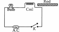 In the AC circuit shown, while keeping K pressed, if an iron rod is inserted into the coil, what happens to the bulb in the circuit?