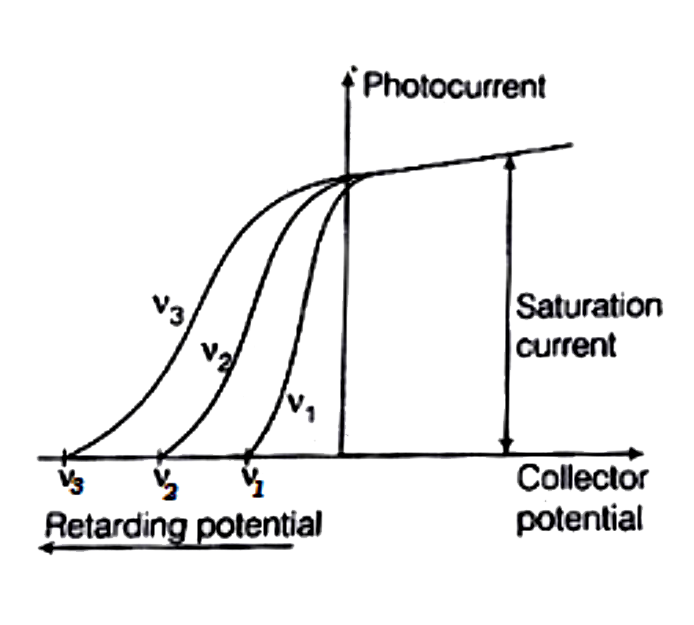 The variation of photocurrent with collector potential for different frequencies of incident radiation $v_1$, $v_2$, and $v_3$ is shown in the graph. Then,