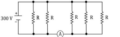 Five identical resistors, each with a resistance of $R = 1500 \, \Omega$, are connected to a 300 V battery as shown in the circuit. The reading of the ideal ammeter A is: