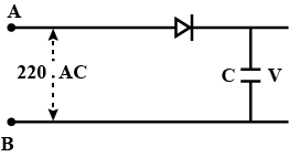A 220 V AC supply is connected between points A and B as shown in the figure. What will be the potential difference $V$ across the capacitor?