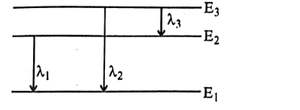 Three energy levels of a hydrogen atom and the corresponding wavelengths of the emitted radiation due to different electron transitions are shown. Then:
