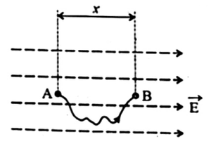 A uniform electric field vector $ \vec{E} $ exists along the horizontal direction as shown. The electric potential at $ A $ is $ V_A $. A small point charge $ q $ is slowly taken from $ A $ to $ B $ along the curved path as shown. The potential energy of the charge when it is at point $ B $ is: