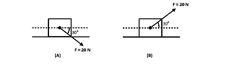 A block of mass 5 kg is (i) pushed in case (A) and (ii) pulled in case (B), by a force F = 20 N, making an