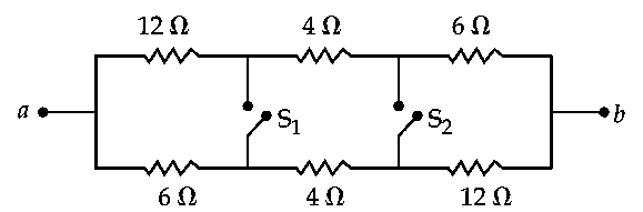 In the given figure switches S1 and S2 are in open condition. The resistance across ab when the switches S1 and S2 are closed is _____________ $\Omega$.